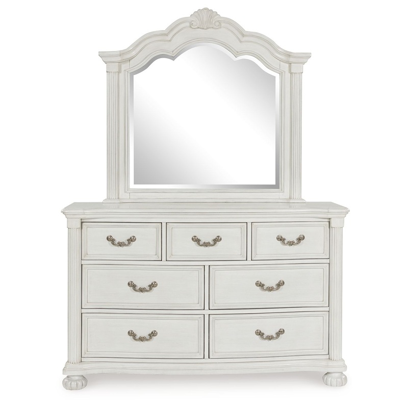 Transform your inner sanctum into a haven of timeless elegance and functionality. This traditionally styled dresser with mirror is adorned in a classic antiqued white finish, highlighted by a serpentine-shaped front with thick decorative moulding. Its drawers are packed with ample storage possibilities. And did we mention the mirror’s crowning glory? Talk about relaxed refinement.