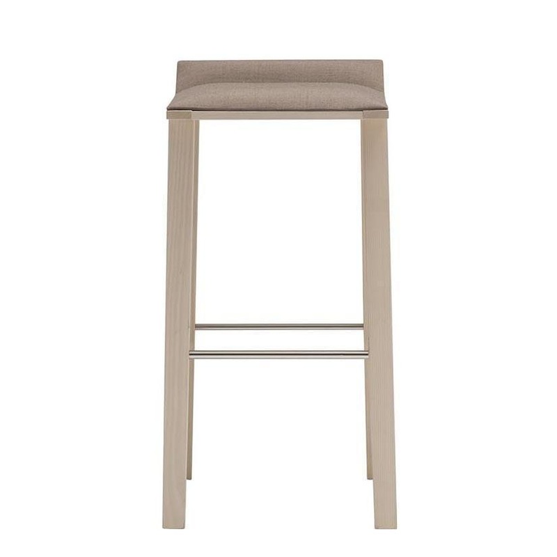 Barstool with upholstered seat and backrest and solid ash wood frame.