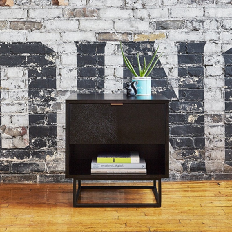 The Myles End Table combines subtle details and craftsmanship to create a storage design that exudes simple sophistication. A drawer features rose gold handles contrasting dark stained, chevron-patterned oak faces. A recessed, slender steel base with black, powder-coated finish creates an illusion of weightlessness. The Myles design incorporates an open space below the drawer, for stylish display of books and magazines. Part of the Myles Storage Series, this table matches perfectly with the Myles Media Stand and Credenza.