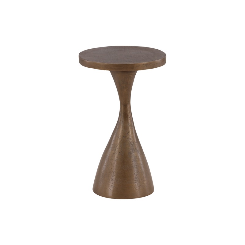 This artistic accent table is defined by its dynamic, fluid form. The hourglass-like silhouette has a beautifully tapered waist, swelling at the top and base with graceful curves that give it a sense of motion. Finished in a rich, antique bronze with a distressed patina, this piece is more than just a surface; it’s a unique and stylish addition to a living room or entryway.