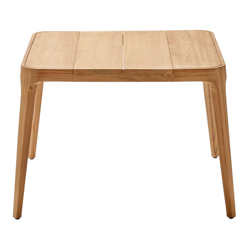 Dining table 100 x 100 centimetres. Frame and top in grade A teak from sustainable logging forests in Indonesia. Adjustable legs.