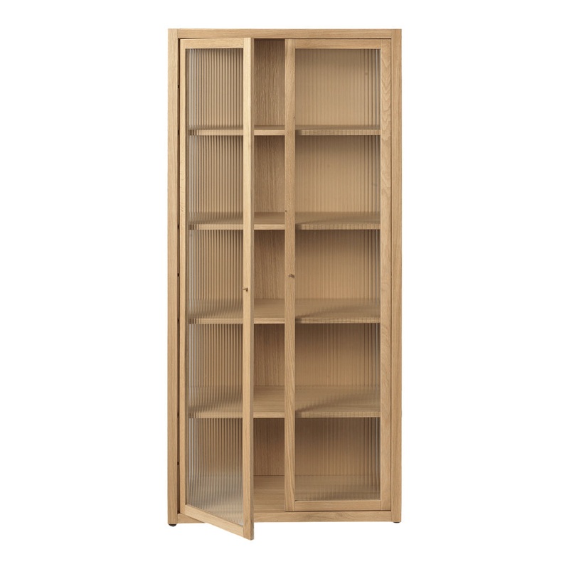 Elevate your space with the Reed Vitrine, crafted from FSC certified solid oak and oak veneer. Combining meticulous craftsmanship with timeless design, this sophisticated piece takes its name from the reeded glass doors that add texture while subtly obscuring its contents. Solid brass handles enhance its elegance while complementing the natural warmth of the oak. The Reed Vitrine offers ample space for books, ornaments, and cherished items and adapts seamlessly to various interior styles, making it suitable for kitchens, dining rooms and living rooms.
