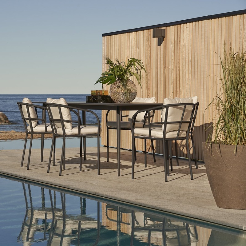 Lounge and dining range, that offers maintenance-free furniture with a distinct, Scandinavian, design. Aluminium frames, gently curved and elegant, with Sunbrella covered cushions, repelling any rain. And high quality outdoor foam, just to get rid of any humidity that could, in theory, get in via the seams.