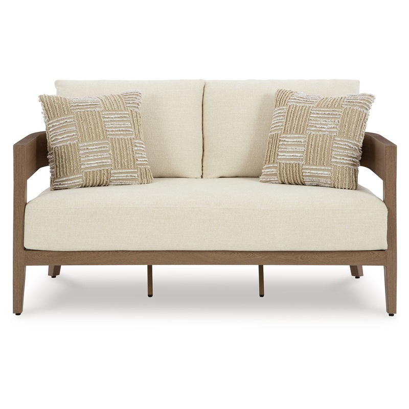 Elevate the appeal of easy-breezy living with this outdoor loveseat. Made to look like wood yet durable enough to weather the elements, it’s sure to serve you and your besties well, year after year. The gently curved piece features cushions wrapped in Nuvella+ high-performance fabric for plush refinement. Patterned accent pillows infuse delightful texture.
