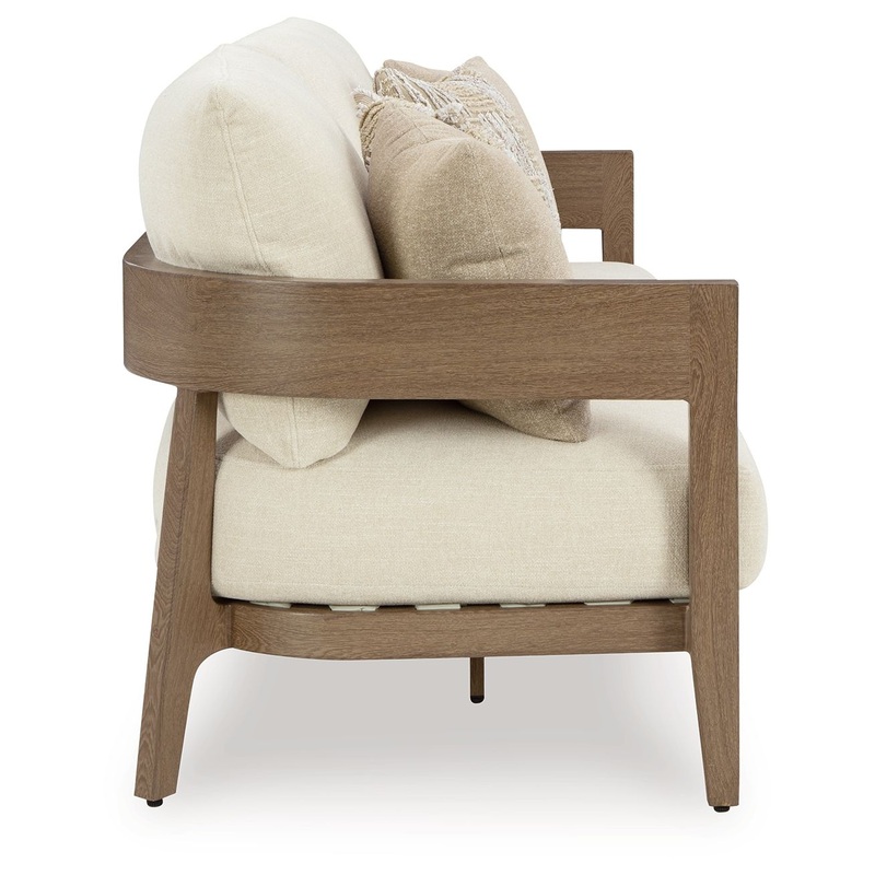 Elevate the appeal of easy-breezy living with this outdoor sofa. Made to look like wood yet durable enough to weather the elements, it’s sure to serve you and your besties well, year after year. The gently curved piece features cushions wrapped in Nuvella+ high-performance fabric for plush refinement. Patterned accent pillows infuse delightful texture.