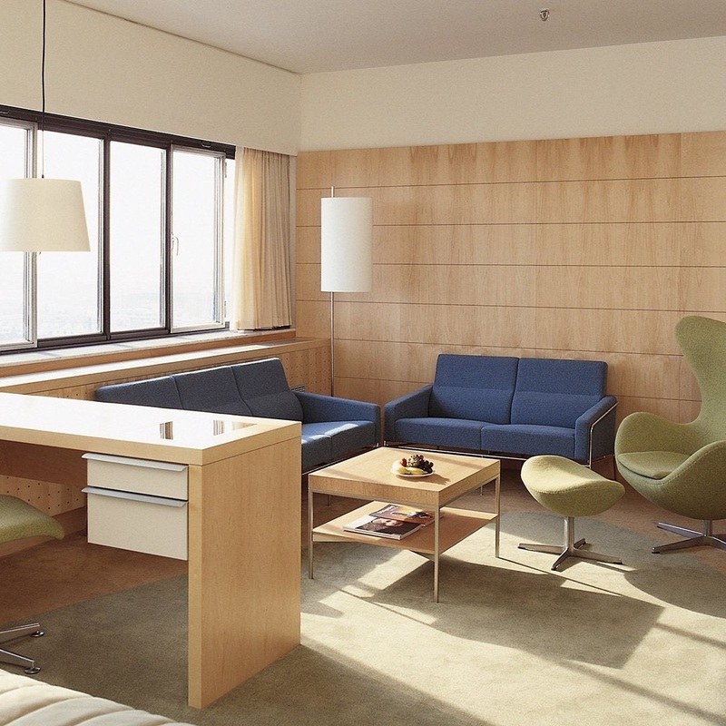 The 3300 series was created for the SAS Terminal at the Royal Hotel in Copenhagen, one of Arne Jacobsen’s architectural masterpieces. In harmony with Jacobsen’s architectural work at that time, the 3300 series is cool and formal. Furthermore, the 3300 series exudes Jacobsen’s unfailing sense of line and proportion and his ability to design everlasting classics. Arne Jacobsen got the inspiration for the 3300 series from a sofa, which he had designed especially for his own home in the 1940s. The 3300 series forms an elegant contrast to the organic shapes of the Egg and Swan chairs, also designed especially for the Royal Hotel. The 3300 series consists of a 1-seater easy chair as well as a 2-seater and 3-seater sofa and is sublime for waiting and lounge areas as well as for private homes. The series 3300 is available in various types of leather and fabric upholstery and always with a chromed base.