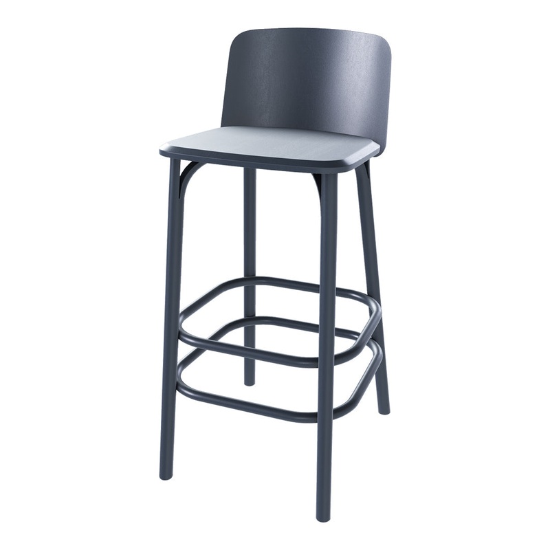 The Split barstool is based on the shapes of a chair, but its lower parts are connected with bent joints. This provides a comfortable rest for the feet while sitting. It is offered in two height variants that can be used in restaurants as well as in private kitchens.