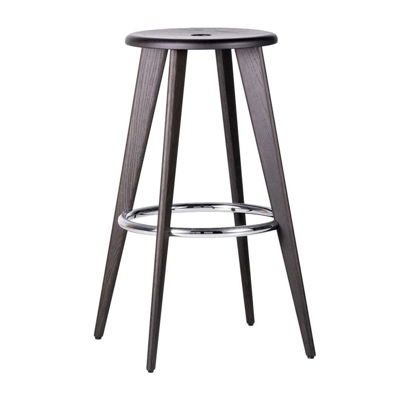 The classic Tabouret Haut bar stool by Jean Prouv is available in robust solid oak, with a natural or dark stained finish. The chrome-plated steel ring with an anti-skid surface guarantees stability and offers comfortable use as a footrest.