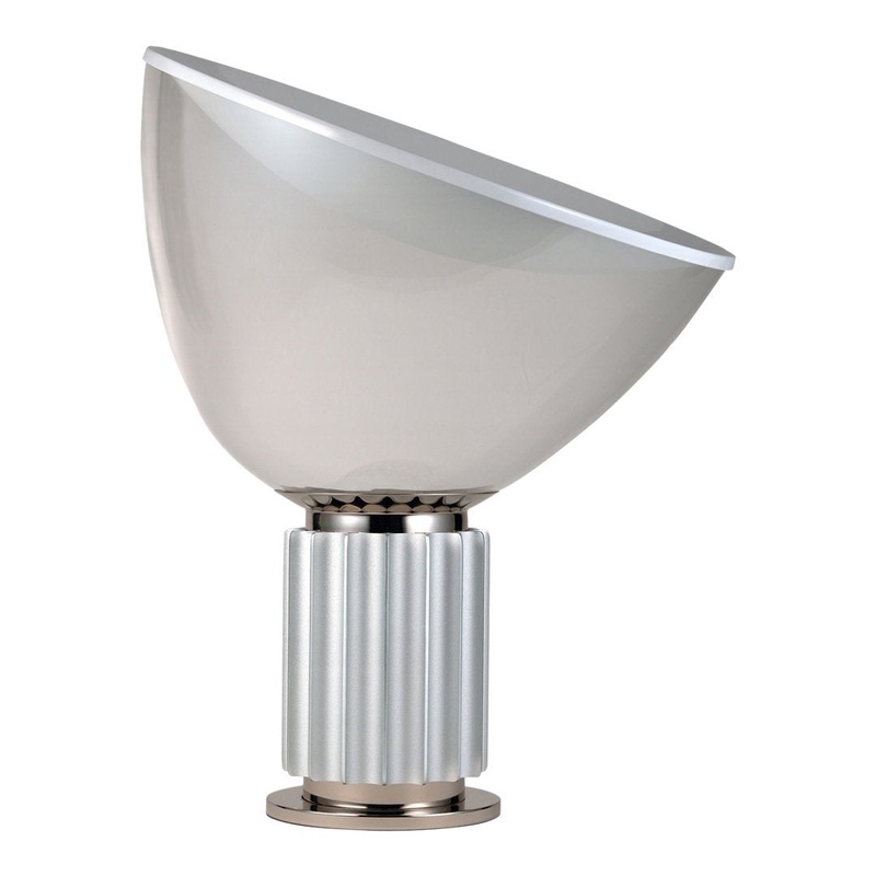 The Taccia emits reflected light. This iconic contemporary table lamp is available in black/anodized aluminum and has two options for its light source: