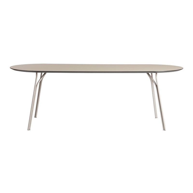 Tree’s sleek metal legs call to mind branches of a tree. The two steel tubes rise from the ground side by side, before their path separates to support the tabletop in several places, while forming an arborescent pattern inspired by the lightness of trees rising. Like a bundle of stems, the legs lift the circular top illustrating the leafy canopy while the round shape invites conversation and gatherings with family and friends.