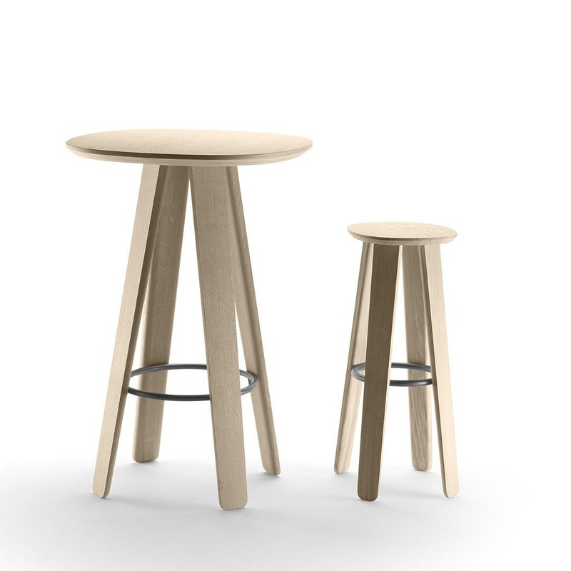The Triku stool has a solid oak structure. It is Available in two heights. The plywood seat can be upholstered in fabric, leather or eco-leather. The metal footrest is painted in white or red.
