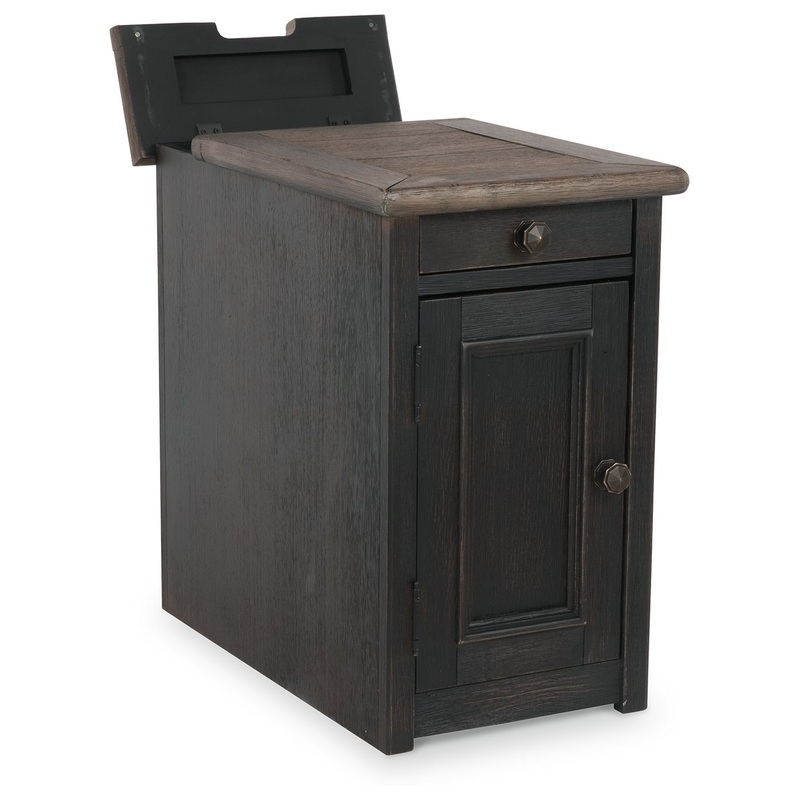 Shabby chic with a hint of down-home country, this chairside end table is all the talk of todays design world. Wood grain shows through the weathered gray-brown top in all of its earthy pleasure. A pull-out tray with lovely traditional hardware has two cup holders. Fuel up your devices with the convenient charging station.