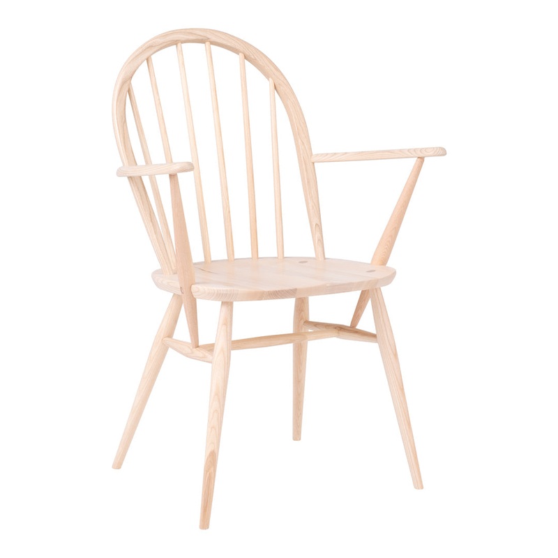 Meticulously crafted and honed to minimalistic perfection, the UTILITY ARMCHAIR boasts a classic Windsor backrest with six, finely-carved spindles and supportive arm rests. A smooth, steam-bent ash bow encases the spindle structure, creating an elegant, sweeping arc that unites the chairs design elements in a simple, harmonious curve. Hammer-shaft joints and gently tapered, outturned legs provide a supple yet dependable profile, allowing the UTILITY CHAIRs lithe form to shine through its honest build. Lastly, traditional wedge and tenon joinery combined with a supportive H-frame inserted underneath the UTILITY CHAIRs saddle seat enhance the overall strength and durability of the chairs construction.