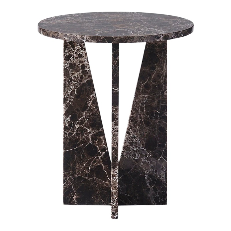 V Side Table is a table made of solid marble or stained ash. The round tabletop rests on a base consisting of triangular legs that together creates a V-shape. The table is handcrafted by skilled carpenters with extensive experience.