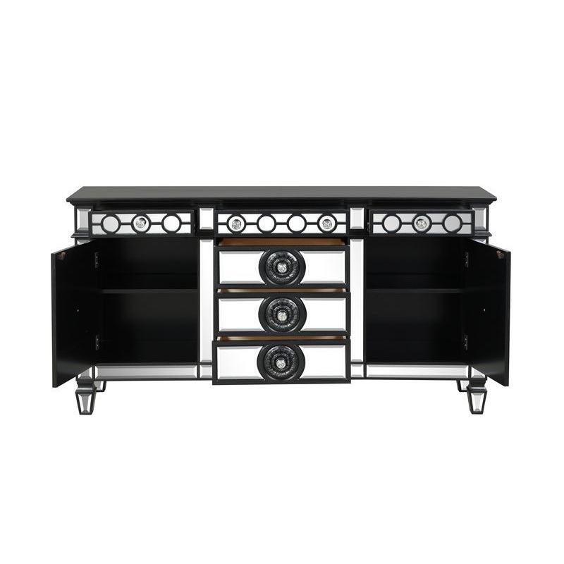 Server Storage: 6 Drawers, 2 Doors (Inside 2 Compartments w/1 Wooden Shelf) Wooden Top & Frame, Raised Geometric Trim, Beveled-Mirror Inlay (Door/Drw/Case), Tapered Leg CONSTRUCTION] Wooden Frame: Beveled Mirror, Wood (Poplar+Rbw), MDF Mirrored Tapered Leg Drawer: GLIDE Side Metal, HARDWARE: Single Crystal-like Pull-Knob (Sunburst Molding)