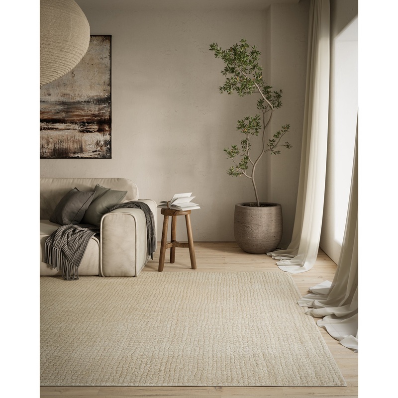 The Waverly Rug collection features high-quality machine rugs that showcase a unique high-low pile in durable polypropylene with accents of polyester. The warm ivory and neutral color palette is designed to echo the sophisticated Moroccan handmade rugs that are inspired by the minimalist Beni Ourain design category. Imperfect lines, subtle yet bold check patterns, and unique effects that mimic a carving technique, offer understated design options for your home.