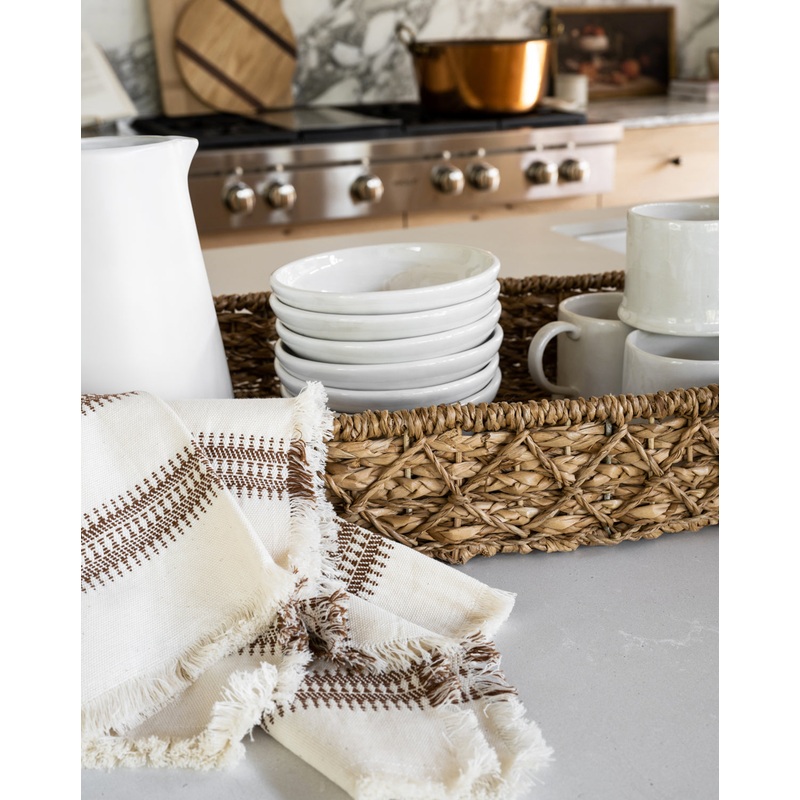 Crafted from cotton in a plain weave, the Woven Stripe Tea Towel has a dyed base that enriches the look and feel of the textile. With simple, detailed stripes and delicate fringe, the Woven Stripe Tea Towel has a whimsical yet traditional feel that adds a subtle touch of detail to your kitchen textiles.