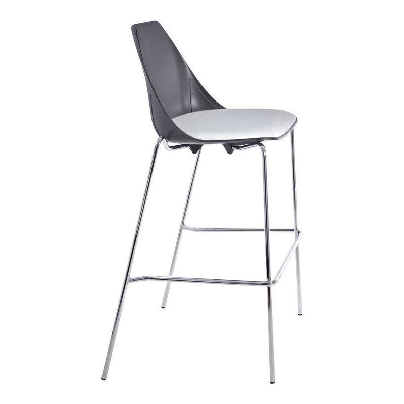 Stool in chromed or painted steel or stained ash wood, 4 legs or skid frame or beech. Inox footrest. Shell in homo-copolymer, X on the seat in contrast or in color (wood or plastic material).Available in two heights.