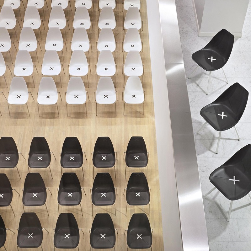 Chair in chromed or painted steel or stained ash wood, 4 legs(also swivel version) or skid frame.Shell in homo-copolymer, X on the seat in contrast or in color(wood or plastic material).