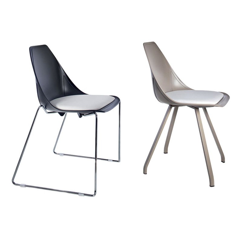 Chair in chromed or painted steel or stained ash wood, 4 legs(also swivel version) or skid frame.Shell in homo-copolymer, X on the seat in contrast or in color(wood or plastic material).