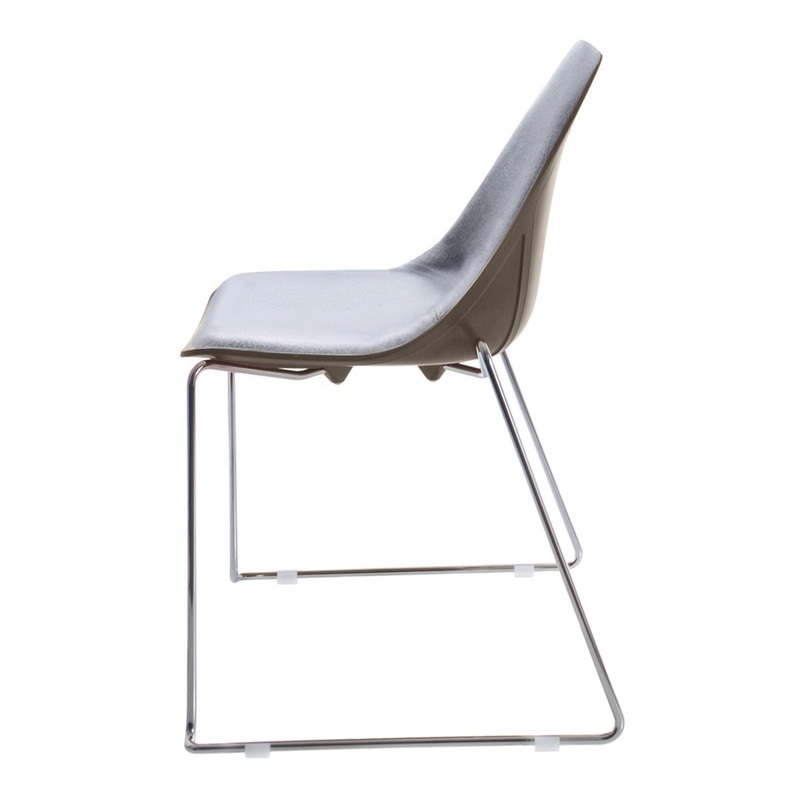 Chair in chromed or painted steel or stained ash wood, 4 legs(also swivel version) or skid frame.Shell in homo-copolymer, X on the seat in contrast or in color(wood or plastic material).