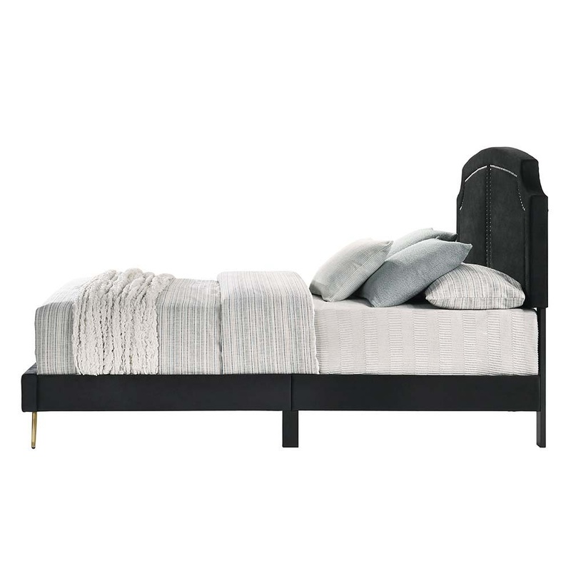 Enjoy a good night’s sleep with this Zeena contemporary bed. Gold-finished nailhead trim on the headboard lends a refined touch. Perched on beautiful and sturdy gold metal tapered legs that pop against the finish. The Zeena bed frame will enhance any bedroom in your home.