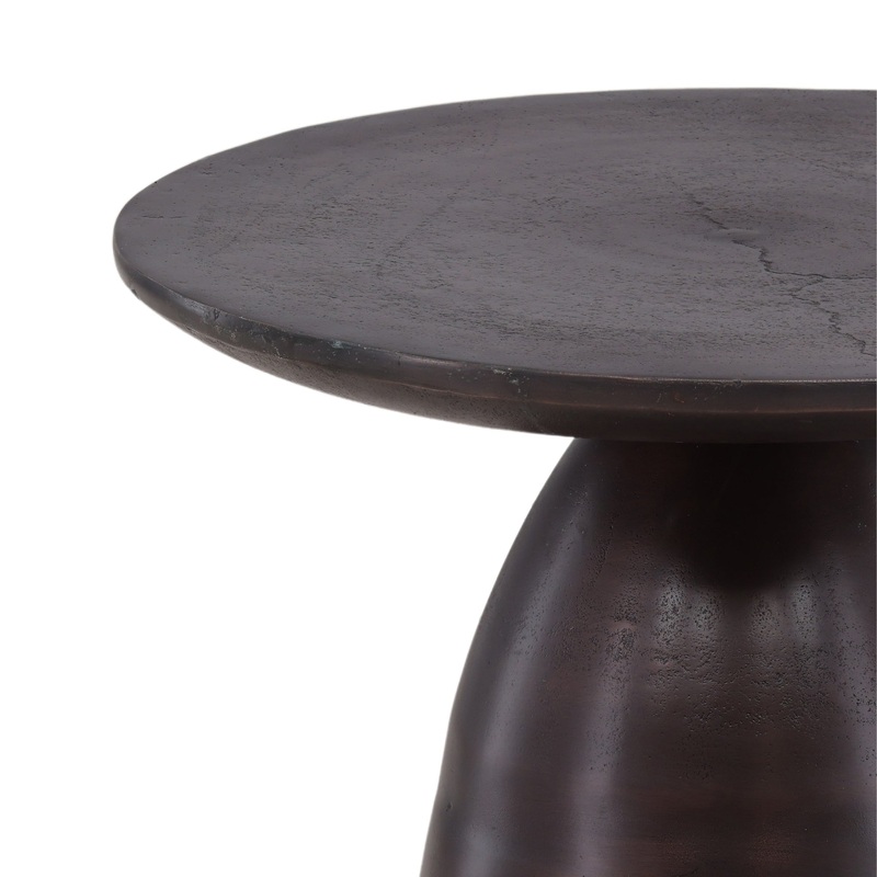 This sculptural side table is a true conversation starter. Its clean, round tabletop appears to float effortlessly above a beautifully tapered, conical base. The entire piece is finished in a rich, dark bronze with a subtle, weathered patina, giving it a timeless and artisanal feel. Perfect as a striking accent piece, it provides a stylish and functional surface for a drink, a book, or a small lamp in any living room or reading nook.